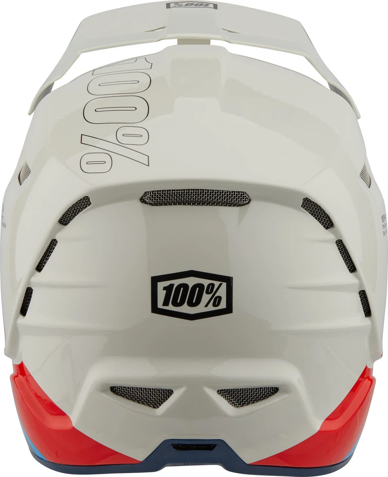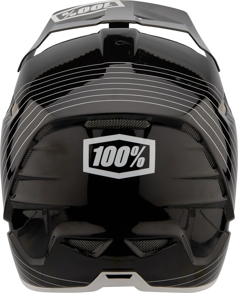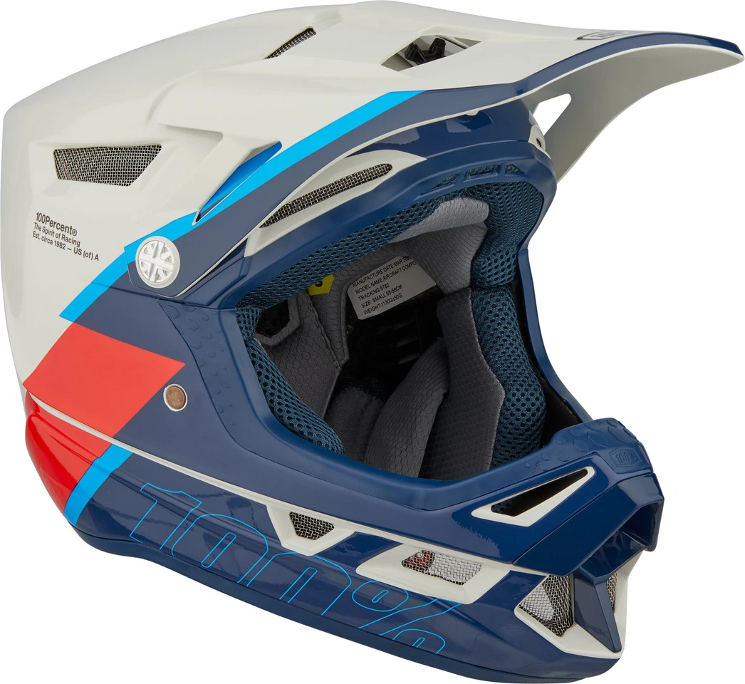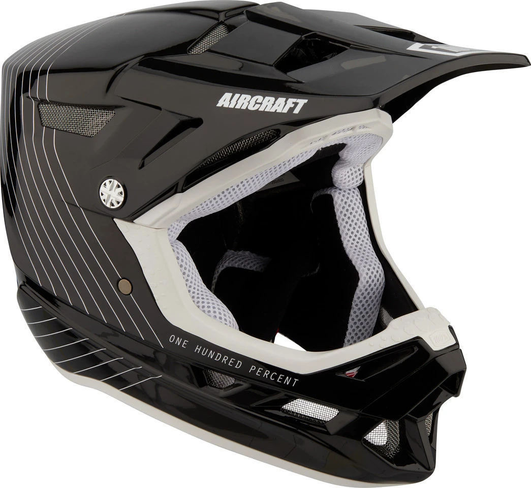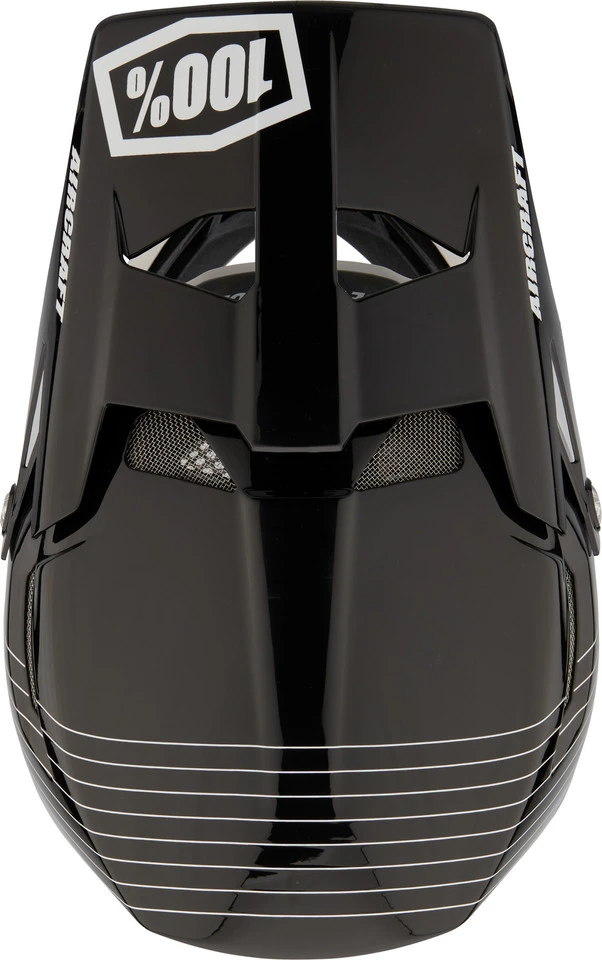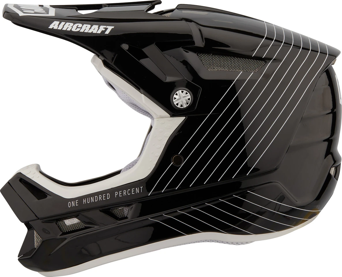 Der 100% Aircraft Composite Fullface-Helm für den Downhill-Einsatz hat eine Glasfaserschale, 25 Belüftungsöffnungen und einen D-Ring-Verschluss.
