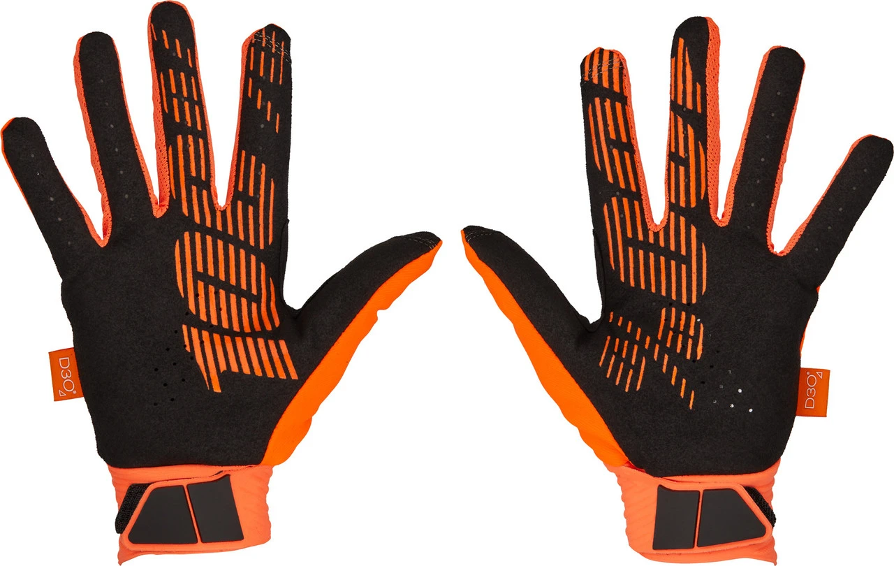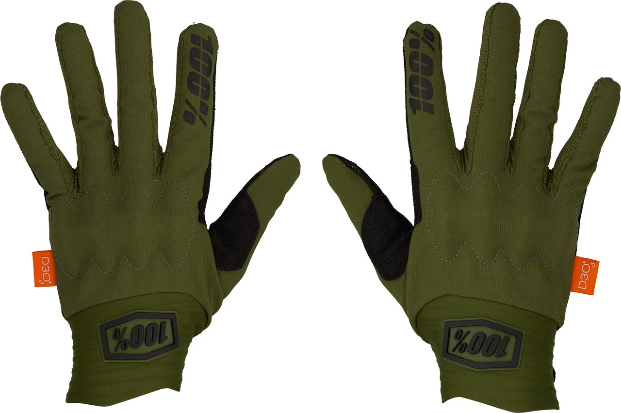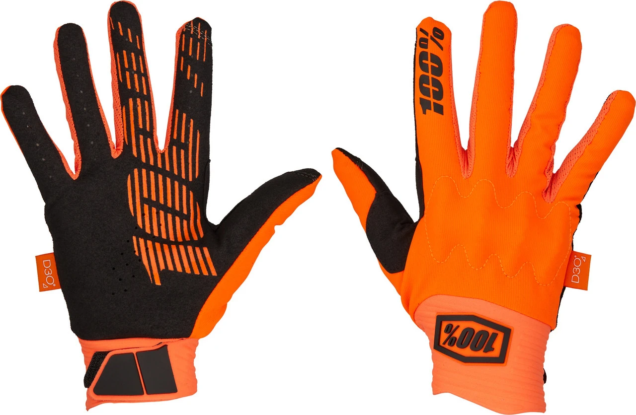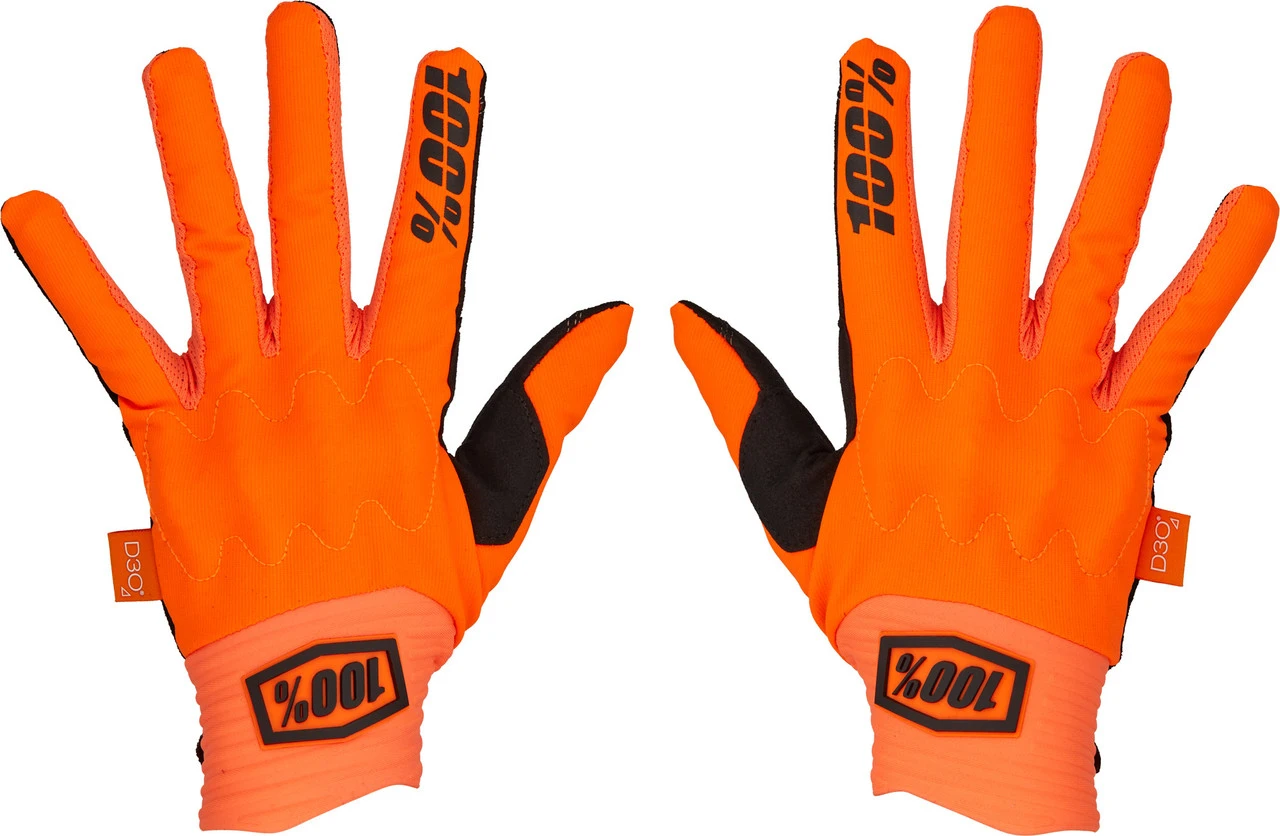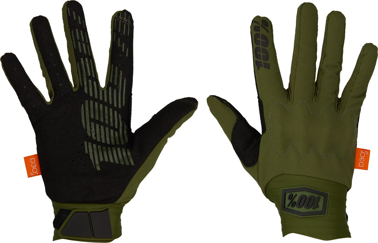 Die 100% Cognito Ganzfinger-Handschuhe für anspruchsvolles Trailriding sind an den Fingerknöcheln mit stoßabsorbierendem D3O-Material ausgestattet. 4-Wege-Stretch-Gewebe sorgt zusätzlich für Strapazierfähigkeit. Außerdem verfügen die Handschuhe über ein komfortables Neopren-Bündchen, einen einstellbaren Klettverschluss und eine einlagige Handfläche aus Kunstleder. Netzeinsätze verbessern die Belüftung, während die Silikonbeschichtung an Fingern und Handfläche den Lenkergrip erhöht.