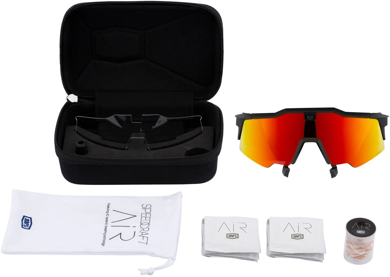 Rahmenfarbe: schwarzGläser: orange verspiegeltLieferumfang:1 x Brille 100% Speedcraft Air1 x Ersatzglas 100% klar und unverspiegelt10 x magnetische Pflasterinkl. Reinigungstücherinkl. Mikrofaserbeutelinkl. Aufbewahrungscase