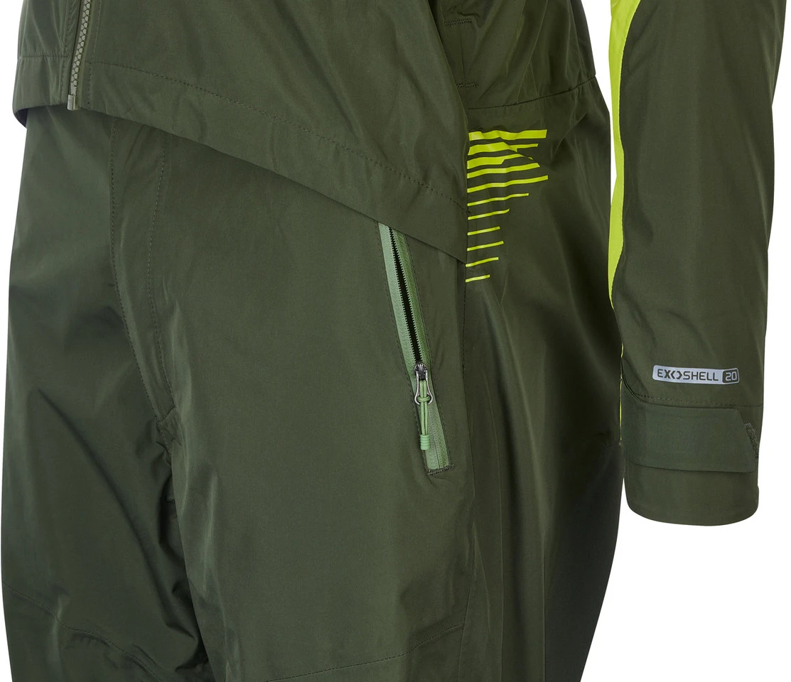 ExoShell20-Textilien sind 3-lagig aufgebaut. Eine dünne PU-Membran wird von einem besonders weichen und geräuschfreien Außenmaterial und einem besonders fein gewebten Innenmaterial eingeschlossen.