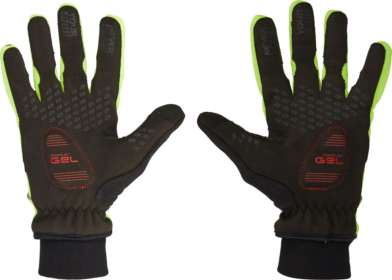Features:hohe SichtbarkeitFrottee-Einsatz am Daumenreflektierende Grafikenverstärkter Grip dank Silikonprints auf der HandflächeTouchscreen-Kompatibilitätwinddichtwasserabweisendelastischer BundatmungsaktivTechnologien:DoctorGel®: