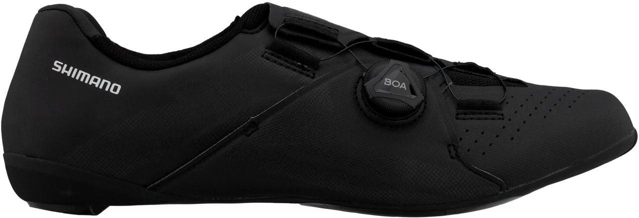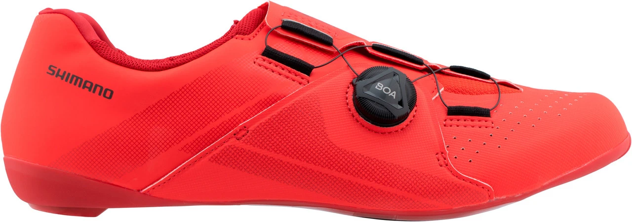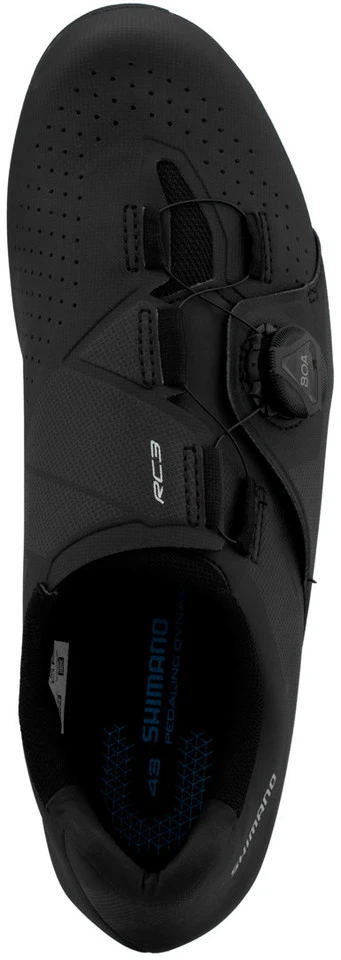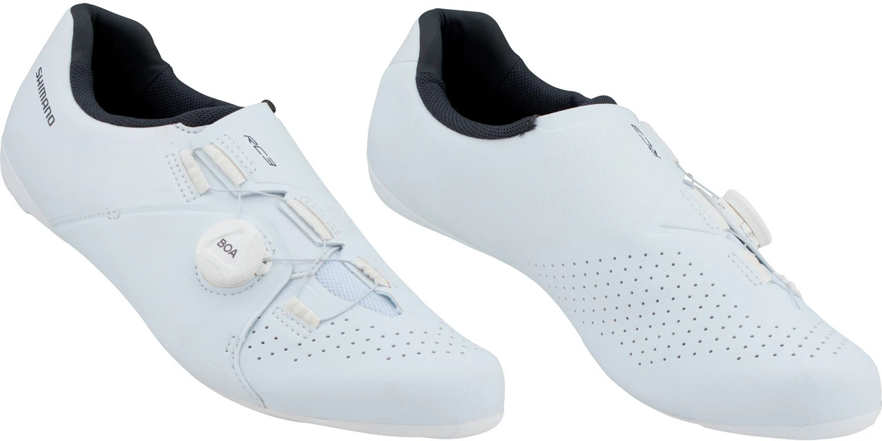 Die Shimano SH-RC300, kurz RC3 genannt, sind Schuhe für ambitionierte Rennrad-Amateure und verfügen über eine nicht allzu steife Außensohle aus glasfaserverstärktem Nylon sowie einen mittig platzierten BOA® L6-Drehverschluss. Dieser lässt nicht nur eine schnelle Einstellung zu, er erzeugt auch ein schlankeres Profil. Zur komfortablen, stabilen Passform tragen außerdem die nahtlos integrierte Zwischensohle und der wenig überlappende Oberschuh bei. Er besteht aus perforiertem Kunstleder, was für Atmungsaktivität und eine sportliche Optik sorgt. Die Shimano Dynalast-Technologie der Schuhleisten fördert die Pedaliereffizienz und wirkt einer vorzeitigen Ermüdung entgegen.