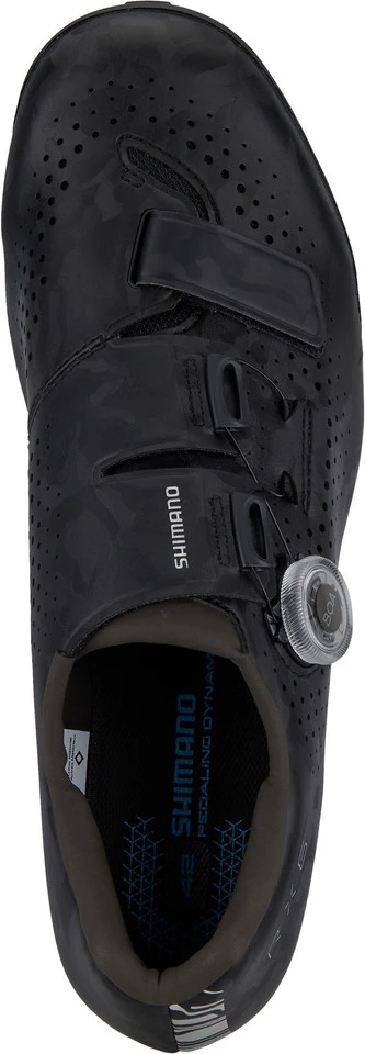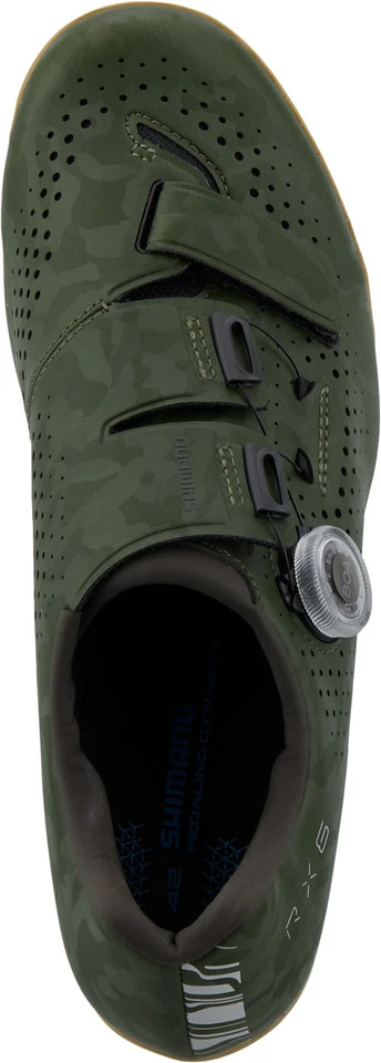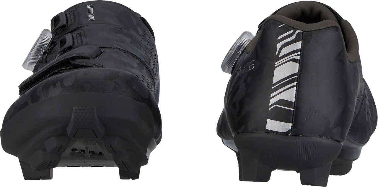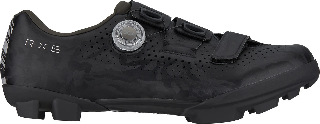 Der SH-RX600 Schuh, kurz RX6 genannt, wurde von Shimano speziell für Graveltouren entworfen. Er hat einen BOA L6K-Drehverschluss zur schnellen Präzisionsanpassung und eine steife, carbonverstärkte Sohle, die auch auf langen Fahrten für Pedaliereffizienz sorgt. An dem breiten Außenprofil und der Fersenkappe kommen TPU-Stollen zum Einsatz, welche die Griffigkeit beim Fahren und Gehen erhöhen. Der umschließend konstruierte Oberschuh bietet viel Komfort durch eine hervorragende Passform. Außerdem fördert die Shimano Dynalast-Schuhleistentechnologie die Kraftübertragung und wirkt einer vorzeitigen Ermüdung entgegen. In Kombination mit SPD-Pedalen entfalten die SH-RX600 ihre volle Performance.