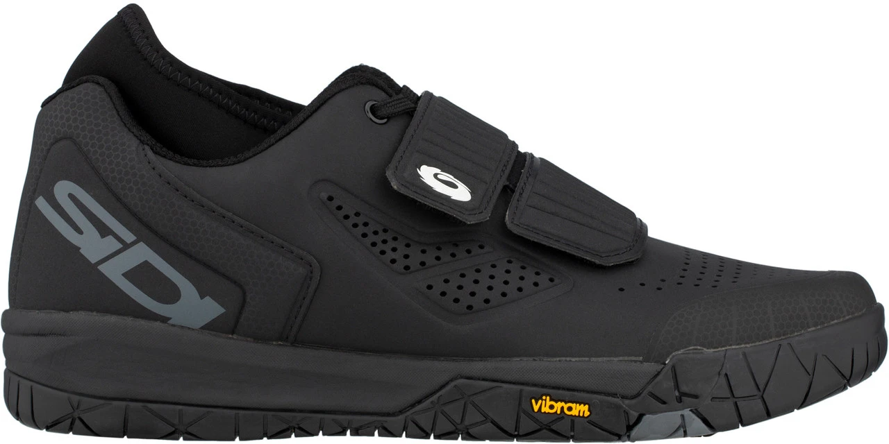 Speziell für die Sidi Dimaro MTB Schuhe wurde in Zusammenarbeit mit dem Hersteller Vibram eine äußerst stabile Sohle kreiert. Sie bietet Gehkomfort, herausragenden Halt auf Plattform-Pedalen und ist dank der herausnehmbaren Profilplatte für die Aufnahme von SPD-Cleats gerüstet. Die Mikrofaser-Oberfläche und mittig platzierte, übergroße Klettbandverschlüsse halten Schmutz ab und den Fuß trocken. Entscheidend für Downhill- und Enduro-Biker sind aber vielmehr der Neoprenschutz über der Ferse, welcher Dreck zuverlässig aus dem Schuh hält, und die an der Fußspitze integrierte, schützende Zehenbox. Leistung bei jedem Rennen, Komfort beim Gehen, guter Grip mit dem Pedal, der Dimaro!
