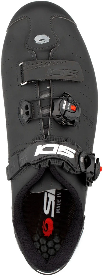 Der Ergo 5 Carbon Mega von Sidi kommt hier in einer Variante für den breiteren Fuß. Das Mikrofaser High-Tech Obermaterial garantiert höchste Strapazierfähigkeit und hohe Atmungsaktivität bei unterschiedlichsten Bedingungen. Mit ihrer carbonfaserverstärkten Nylonsohle mit Vollcarbon-Einsatz bieten diese Rennradschuhe genau die richtige Mischung aus optimaler Kraftübertragung und Flexibilität im Vorfußbereich. Eben die perfekte Kombination aus Steifigkeit und Komfort. Auf der Unterseite des Schuhs befindet sich eine Ausrichtungsskala, damit Du Deine Pedale optimal positionieren kannst. Der Push-Button auf den Tecno 3 Drehverschlüssen, die sich seitlich am Schuh befinden, erleichtert das sensible Anpassen des Schuhs während der Fahrt.