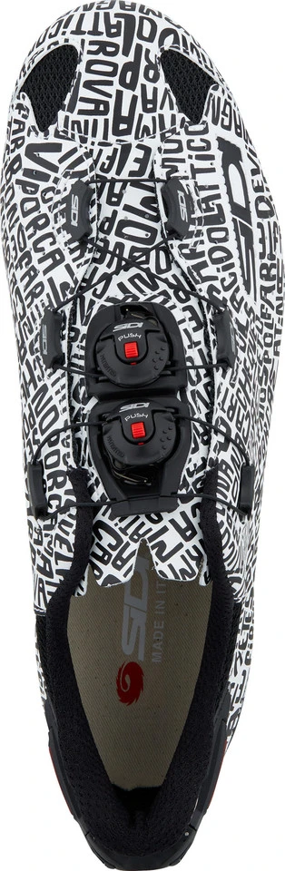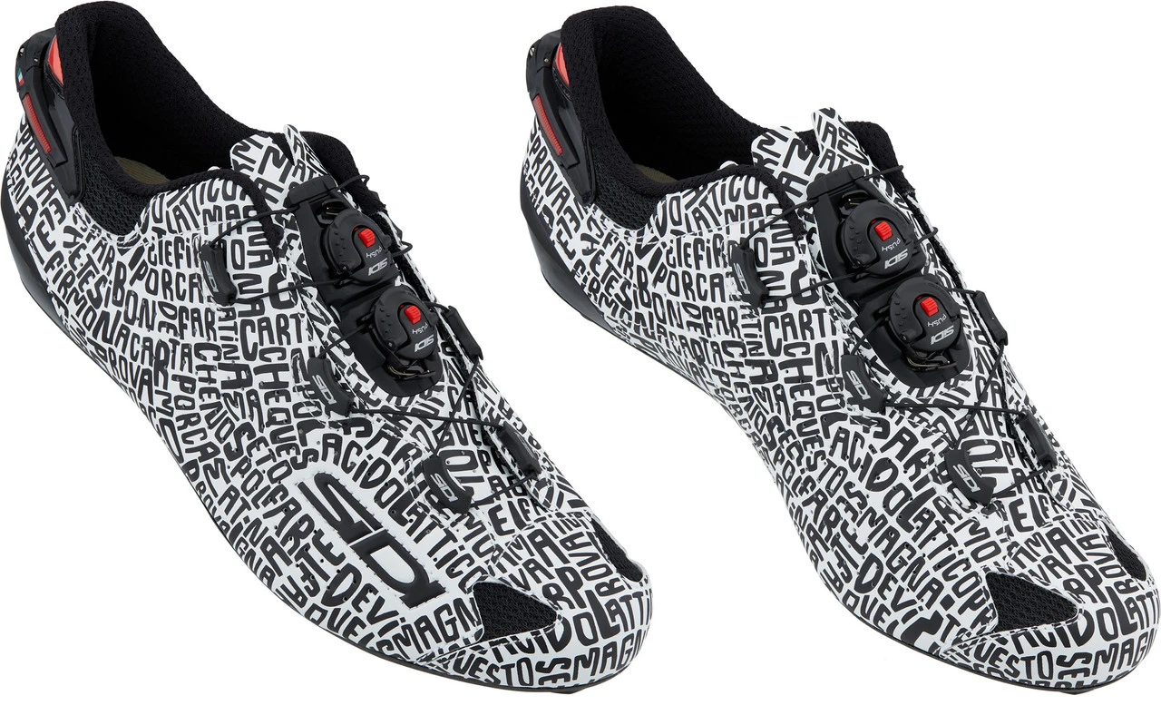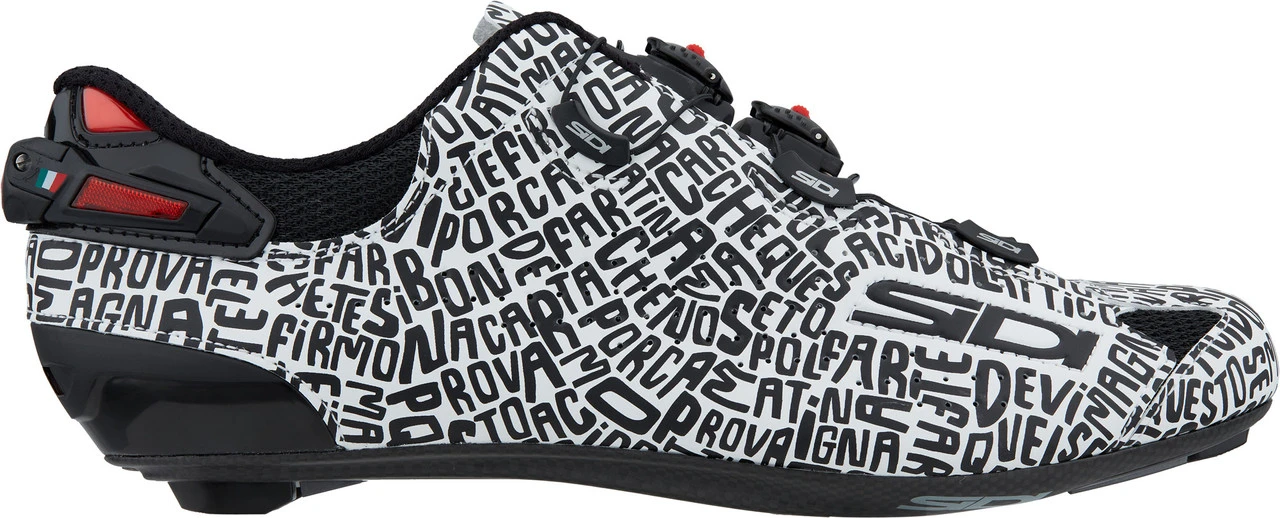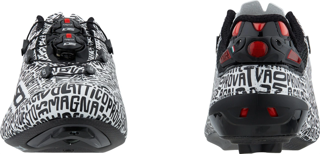 Die Shot 2 DZero Rennradschuhe von Sidi überzeugen mit denselben Vorzügen wie das Standardmodell Shot 2 und bieten Dir zugleich die Gewissheit einer nachhaltigen Produktion. Sie bestehen aus recycelter Mikrofaser und biobasierten Harzen. Dadurch fällt bei der Herstellung wenig CO2 an und die Entsorgung ist für die Umwelt verträglicher. Optisch begeistern die Schuhe mit ihrem einzigartigen Dekor, das Zitate von Sidi-Gründer Dino Signori zeigt. Die Shot 2 DZero haben eine steife Carbonsohle mit Boost-Passform im Mittelfußbereich, welche für perfekte Kraftübertragung sorgt. Belüftete, austauschbare Einsätze aus Nylon und TPU schützen das Carbon an den besonders beanspruchten Stellen. Cleats können um 5 mm versetzt angebracht werden. Die zwei Drehverschlüsse dienen der gleichmäßigen Verteilung des Drucks und weisen einen Push-Knopf zum schnellen Aus- und Anziehen auf. Im Fersenbereich lässt sich die Passform individuell einstellen. Eine Fersenkappe sorgt hier für zusätzliche Stabilität.