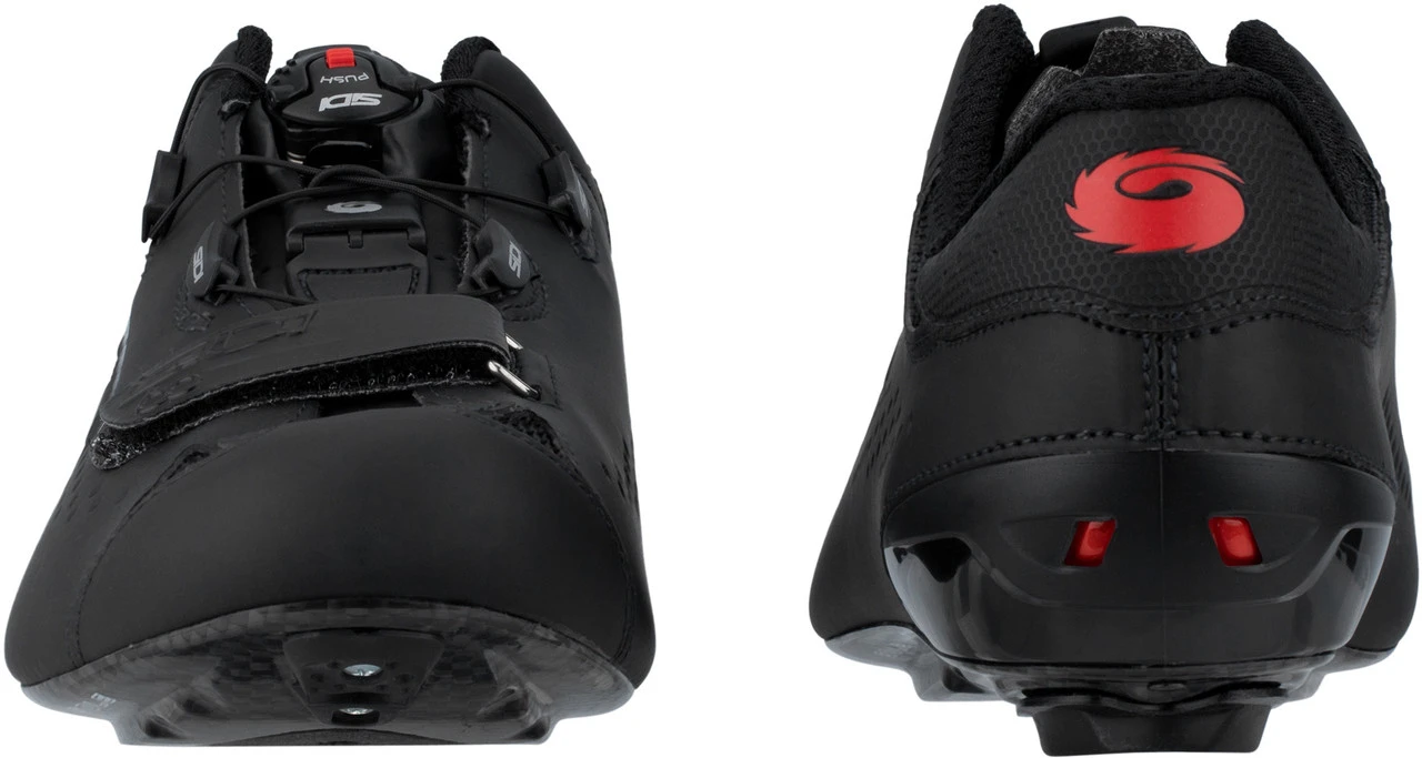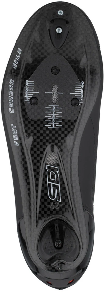 Leichte und supersteife Vollcarbon-Sohle für maximale Kraftübertragung. Mit integriertem, verschließbarem Lufteinlass und Lüftungskanal für eine ideale Ventilation des Fußes auch bei hohen Temperaturen. Minimaler Flex im Vorfuß-Bereich zur Entlastung der Sehnen und um Durchblutungsstörungen zuverlässig entgegenzuwirken. Kunststoff-Absatz austauschbar. Ausrichtungsskala für optimale Positionierung der Pedalplatten.