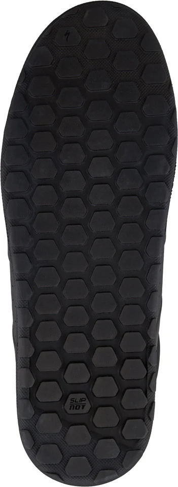 Der 2FO DH Flat von Specialized ist ein robuster, leistungsstarker Schuh für Downhill-Athleten, die mit Plattformpedalen unterwegs sind. Das verstärkte Obermaterial aus Kunstleder und Textil zeichnet sich nicht nur durch Langlebigkeit aus, zusammen mit dem erhöhten Sprunggelenkschaft bietet es dem Fuß auch Schutz und Stabilität im Extremeinsatz. Hinzu kommt ein spezielles wasserabweisendes Netzgewebe, welches die Trocknungszeit verkürzt. Für satte Traktion ist die SlipNot™ ST Gummi-Außensohle zuständig. Wie alle Schuhe von Specialized wurde auch dieses Modell nach Body-Geometry-Gesichtspunkten designt, d. h. ein Fußbett und andere unterstützende Elemente bewirken eine optimale Fußausrichtung und fördern gelenkschonendes Pedalieren. Die gepolsterte Schaumstoff-Zwischensohle und der großzügige Leisten tragen ebenfalls zum Komfort bei. Der 2FO DH Flat wurde in Zusammenarbeit mit dem dreifachen DH-Weltmeister Loic Bruni entwickelt und bietet zusätzlich zu seinen funktionalen Features auch eine Extraportion Style.