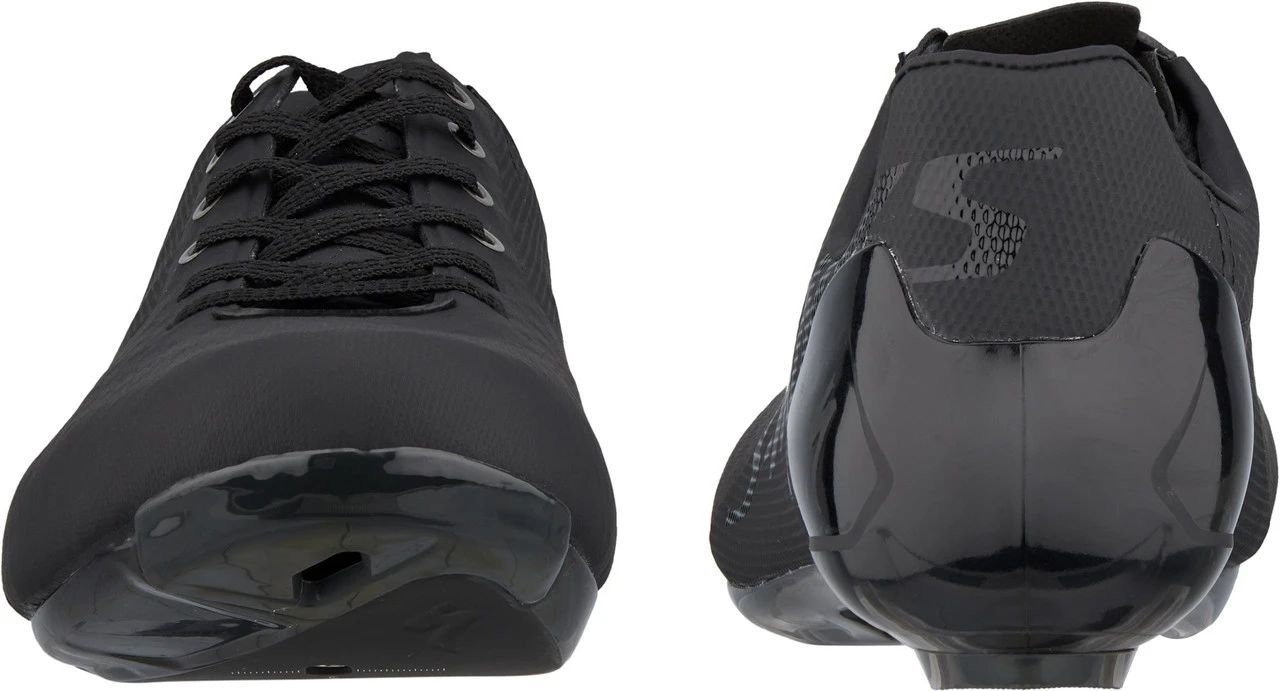 Mit dem S-Works 7 Lace Road Schuh bekommst Du die Leistungsfähigkeit des bewährten Specialized S-Works 7 gepaart mit einem Schnürverschluss, der für eine einzigartige Passform sorgt. Die Schnürsenkel setzen an 12 gleichmäßig verteilten Punkten an und bieten so angenehmen, zuverlässigen Halt. Zugleich wurde das Kunststoff-Obermaterial zu einem Großteil durch Netzgewebe ersetzt, was die Geschmeidigkeit erhöht und das Gewicht niedrig hält. Gezielt eingesetzte TPU-Bereiche verbessern Stabilität und Performance. Geblieben sind die ultrasteife Carbonaußensohle für optimalen Powertransfer sowie die umschließende Fersenkonstruktion, welche der Beschleunigung zugutekommt. Natürlich wurde auch dieser Schuh nach ergonomisch-medizinischen Body-Geometry-Kriterien designt, sodass Sohlen und Fußbett eine gesunde Pedalierbewegung begünstigen und Überlastungen vorbeugen. Der geräumige Zehenbereich fördert zusätzlich den Komfort. Außerdem hast Du die Möglichkeit, die Titan-Schuhplatteneinsätze zu drehen, um die Cleats weiter hinten zu montieren. Das austauschbare Fersenprofil wurde für mehr Sicherheit aus Anti-Rutsch-Material gefertigt und mit versenkten Befestigungsschrauben versehen.