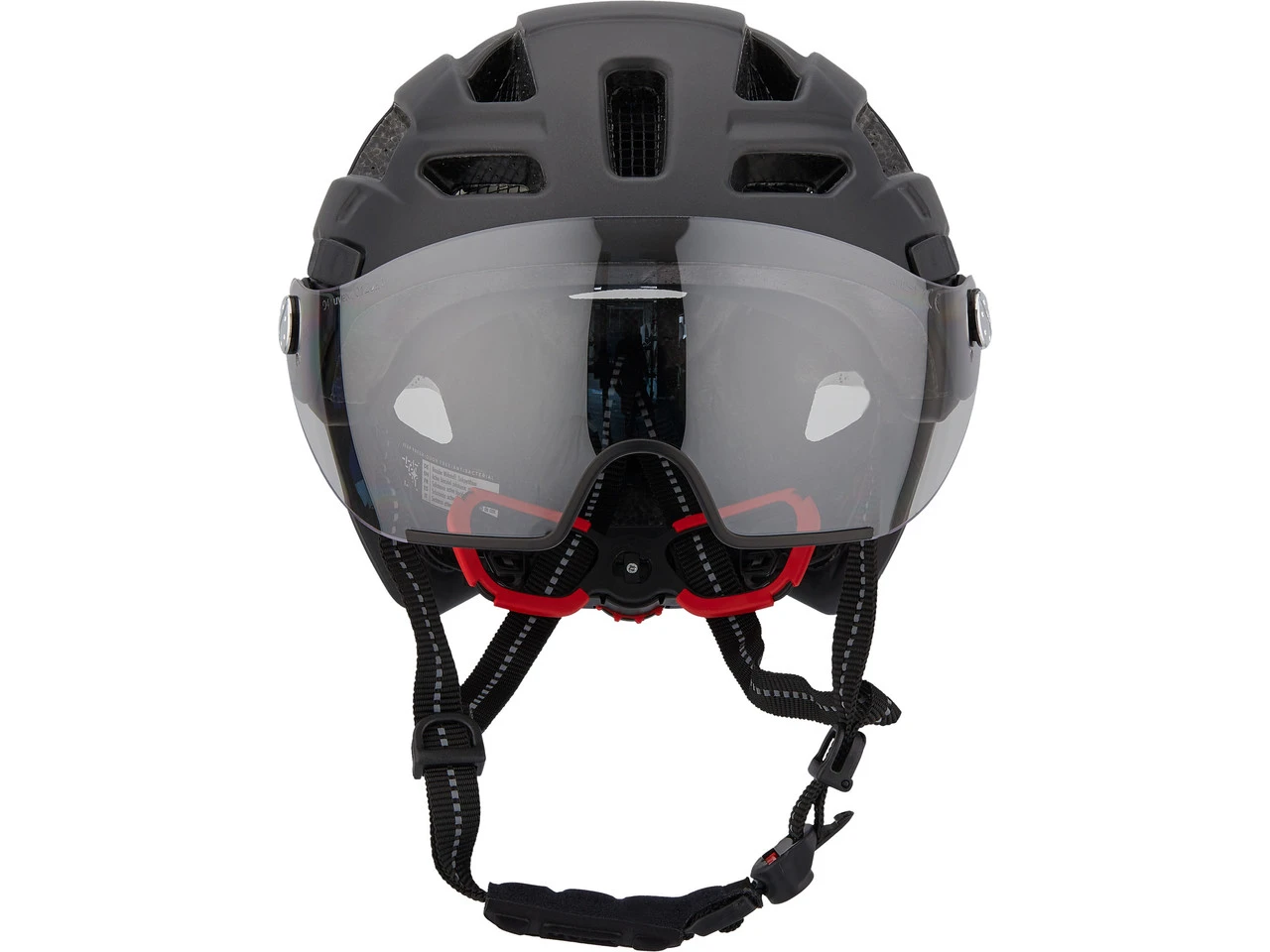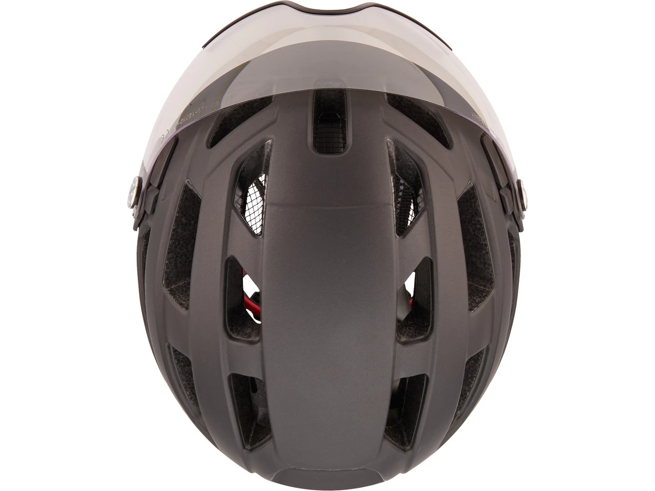Aufsteigen, Visier runter und los geht’s. Das integrierte Allwetter-Visier (Schutzstufe 1) schützt die Augen im Straßenverkehr optimal vor Sonne und Wind. Auch für Brillenträger ist der Helm bestens geeignet, denn er kann locker über der Korrekturbrille getragen werden. Zudem ersetzt das Visier mühelos die Sonnenbrille und erweitert das Sichtfeld. Für einen höheren Sonnenschutz kann das Visier gegen ein dunkleres in Schutzstufe 3 getauscht werden. Zur besseren Sichtbarkeit im Straßenverkehr hat der Finale Visor ein integriertes LED-Licht am Hinterkopf.