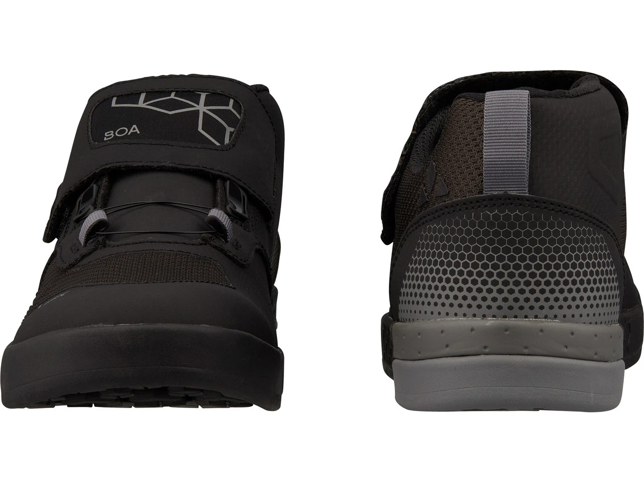 Der AM Moab Tech ist genau das Richtige für abfahrtsorientierte Mountainbiker. Die asymmetrische Schaftkonstruktion in Kombination mit dem Boa-Drehverschluss sorgt für die richtige Stabilität und lässt sich perfekt und individuell an Deinen Fuß anpassen. Eine zusätzliche Abdeckung des Verschlusses schützt vor Schmutz und sorgt für weitere Stabilität. Das angeraute Fersenfutter sowie die anatomisch vorgeformte Einlegesohle unterstützen die sportliche Passform. Die Einlegesohle ist im Pedalbereich mit härterem PU-Schaum ausgestattet und liefert perfekte Kraftübertragung auf das Pedal. Für zusätzlichen Komfort und Schutz sorgt die Mittelsohle, die im Fersenbereich ein zusätzliches Dämpfungselement eingearbeitet hat. Der hochgezogene Kragen auf der Knöchelinnenseite bietet Schutz vor Kurbelschlägen. Die verstärkte Zehenkappe schützt vor Steinen und Ästen. Für perfekten Grip auf dem Pedal sorgt die AM Flat Sohle, denn im Pedalbereich wurde ein abgestuftes Hexagon-Profil mit einer weichen Gummimischung kombiniert. Im Zehen- und Fersenbereich hat die Sohle eine tiefere Profilierung, die in Trage- und Schiebepassagen den nötigen Halt bietet. Zusätzlich fungieren die Hexagons wie Schuppen, die auch beim Gehen für den richtigen Halt sorgen. Das Futtermaterial enthält zu 40 % recycelte Materialien. Die komfortable Einlegesohle besteht aus umweltfreundlichem Schaum und 50 % recyceltem Polyester.